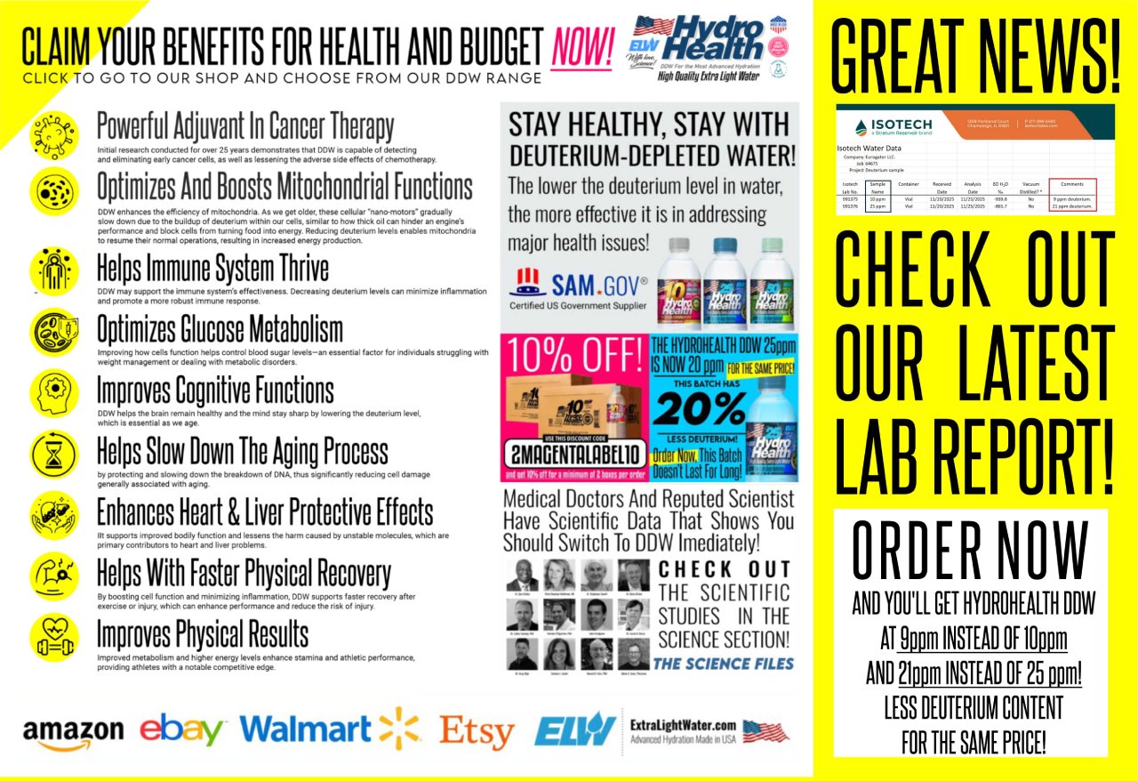 Deuterium-depleted water (DDW), also known as light water (or ”extra light water”, like our products, who have a very low Deuterium concentration) is water which has a lower concentration of deuterium than occurs naturally. In “Vienna Standard Mean Ocean Water” VSMOW (*) deuterium occurs at a rate of 155.76 ppm. All natural occuring water, like drinking water has deuterium levels around this value. (*) (VSMOW) is a water standard defining the isotopic composition of fresh water. Simply put, deuterium-depleted water is natural water cleared of most of its heavy, radioactive components thru an advanced technologial process. This is why deuterium-depleted water is called ”light water”.